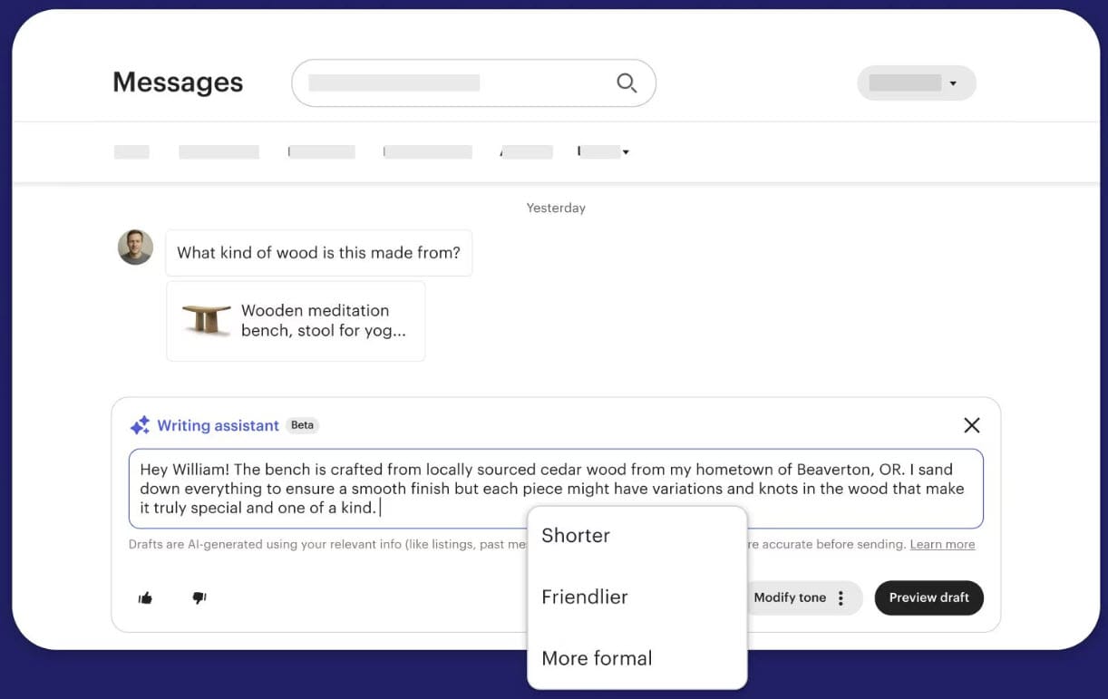 The Writing Assistant is an optional, AI-powered tool that helps you save time drafting messages to buyers. It uses relevant information from your shop—like item descriptions and similar messages you’ve sent in the past—to craft responses that stay true to your unique voice.
