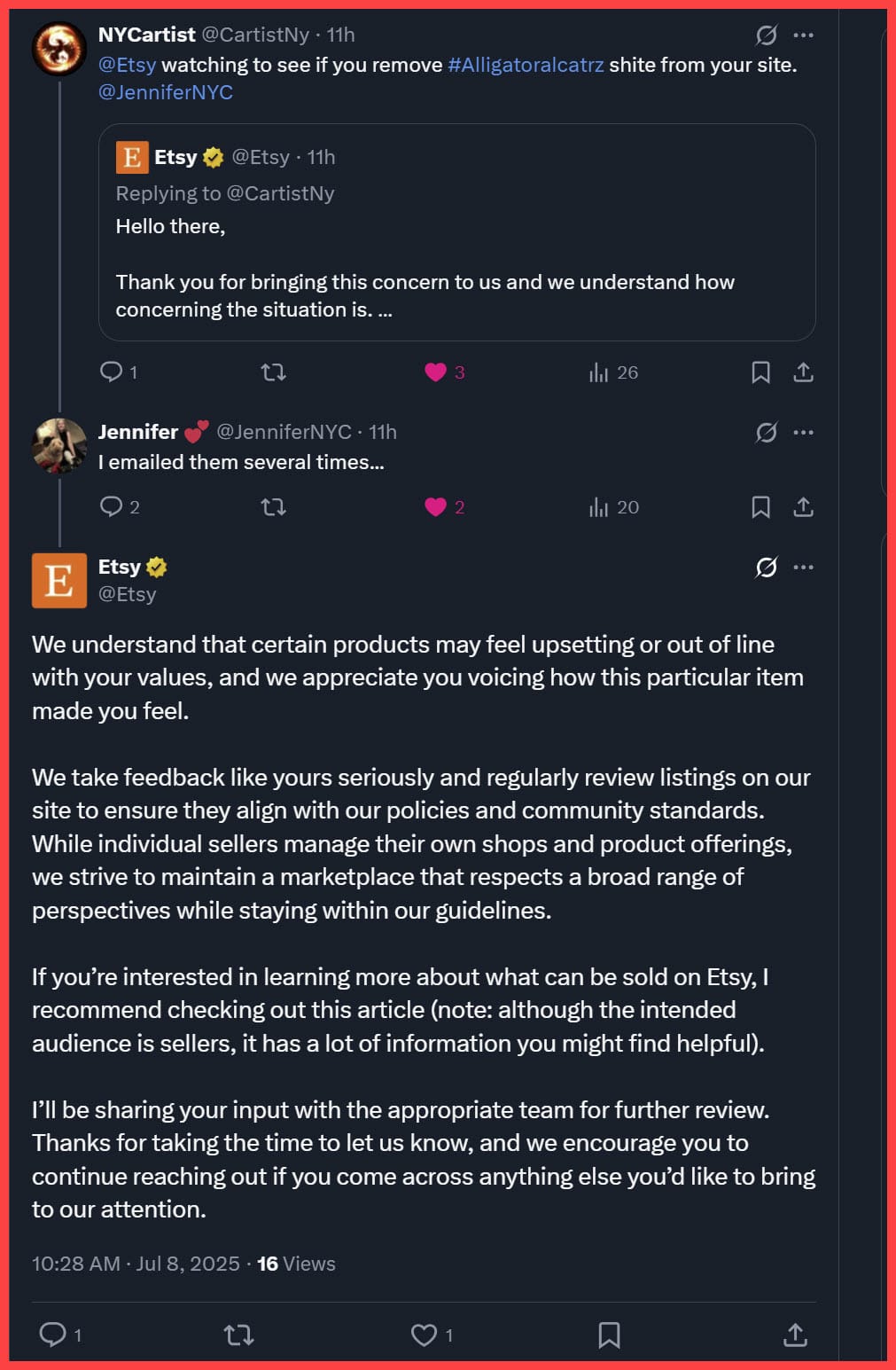Etsy is in the hot seat as social justice conscience buyers take to social media calling for boycott over sales of Alligator Alcatraz merch they say glorifies hate and violence against immigrants in direct violation of Etsy policies.