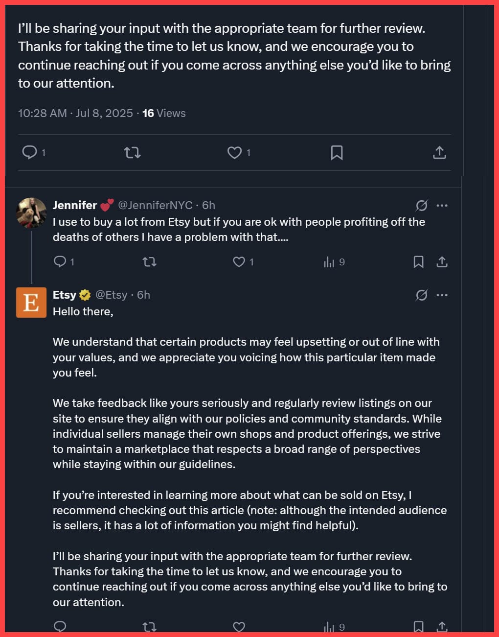 Given the current state of political affairs and Etsy's already precarious position with investors due to lagging business performance, it's unlikely the Board and/or CEO Josh Silverman will take an explicit public stance on this issue - but if the Etsy Strike movement in 2022 taught us anything it would be not to underestimate the power of social media and highly engaged users.