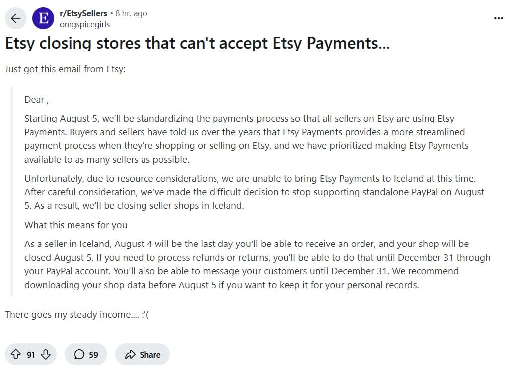 For example, one seller in Iceland posted the email they received on Reddit, saying "there goes my steady income":