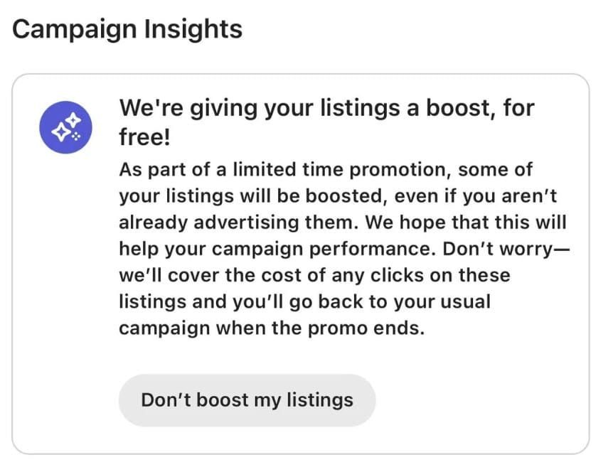 As part of a limited time promotion, some of your listings will be boosted, even if you aren’t already advertising them. We hope that this will help your campaign performance.Don’t worry—we’ll cover the cost of any clicks on these listings and you’ll go back to your usual campaign when the promo ends.
