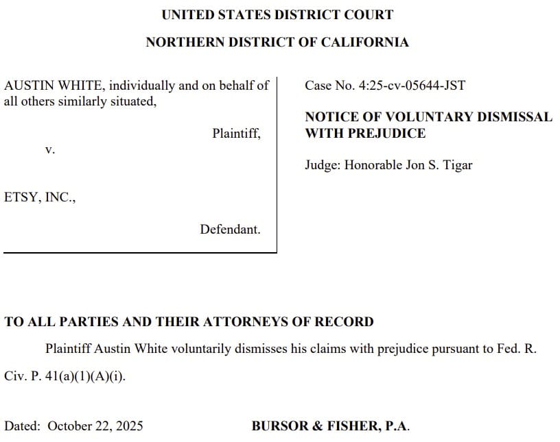 The case against Etsy is White v. Esty Inc., N.D. Cal., No. 4:25-cv-05644