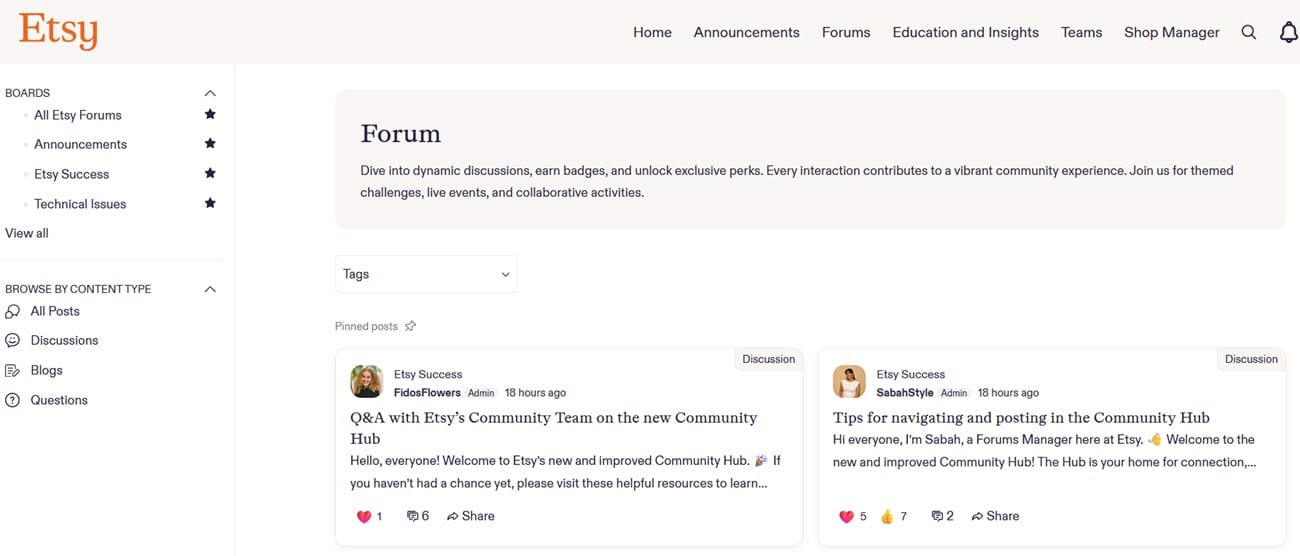 - Homepage: Explore trending discussions and use the AI-powered search to find answers across Etsy resources, including the Seller Handbook and Help Center.
