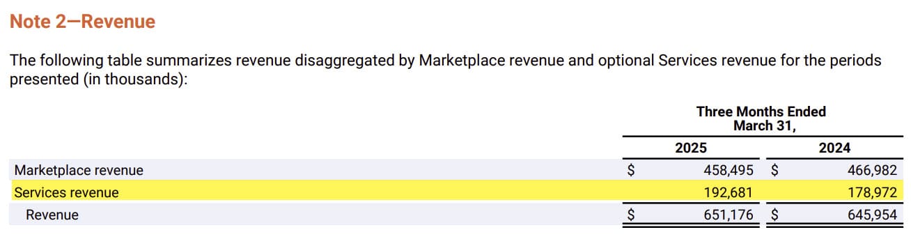 While the ideas put forth in that survey have not (yet) come to fruition, it's clear that Etsy sees seller paid services as a potential revenue generator, especially as Services Revenue (money made from optional services like onsite advertising, shipping labels and other paid offerings) has continued to see strong growth in recent quarters, despite lagging Gross Market Sales and Active Buyer stats.