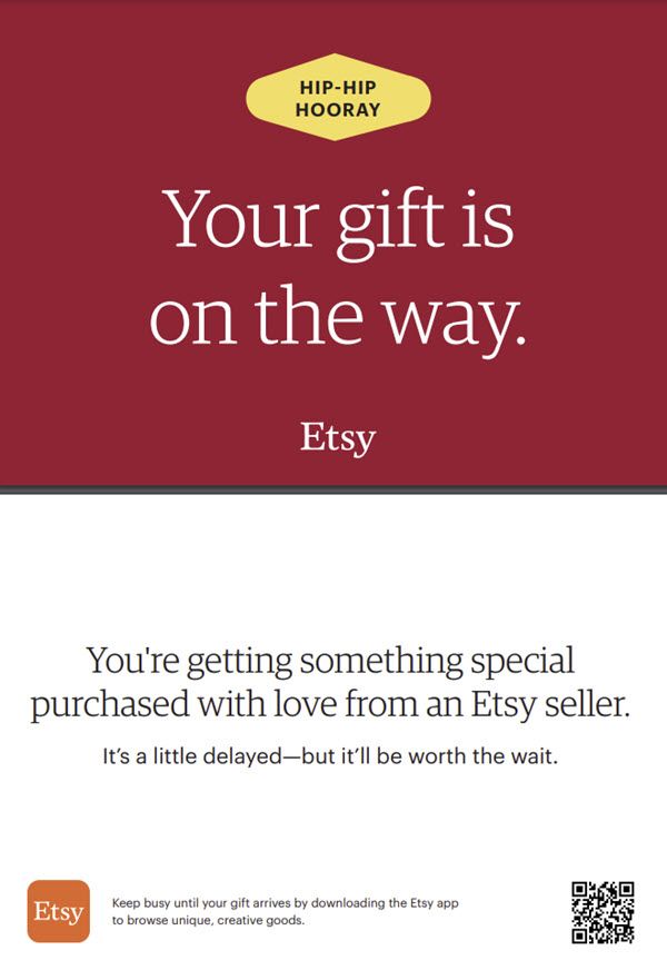 - This year, we’ll also send shoppers a digital card they can give to gift recipients to let them know they’re getting something special from Etsy, but it’s a bit delayed. You can save it to send to your customers if they need it.