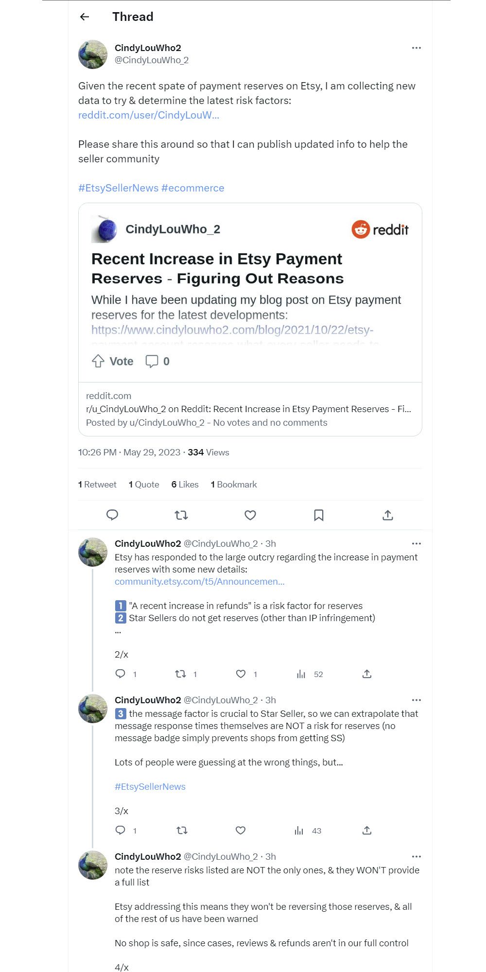 Etsy seller and ecommerce consultant Cindy Baldassi has been researching and collecting data to determine the latest risk factors and bring attention to the situation on Twitter and Reddit.
