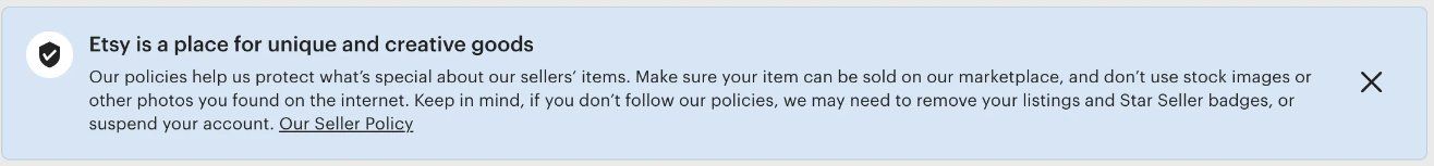 Etsy now posting warnings on some shop dashboards/listing managers about making sure your product is allowed on Etsy, & not using stock photos or mockups.