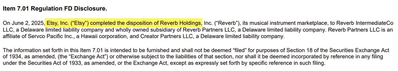 Etsy's sale of Reverb to Servco Pacific Inc and Creator Partners LLC is complete, according to an 8-K filed with the SEC today.