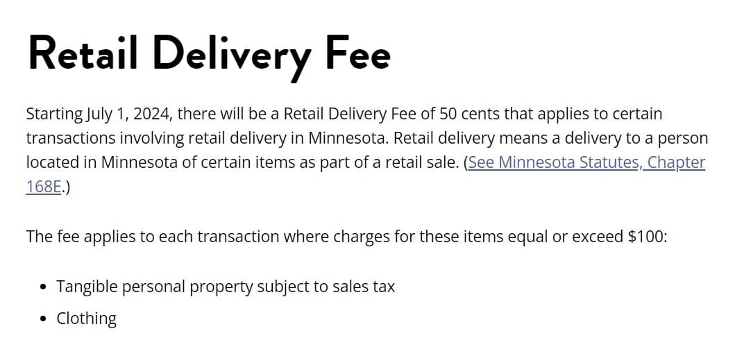 It's also concerning that Etsy's Sales Tax Help Page does not mention the Minnesota Retail Delivery Fee that went into effect on July 1, 2024.