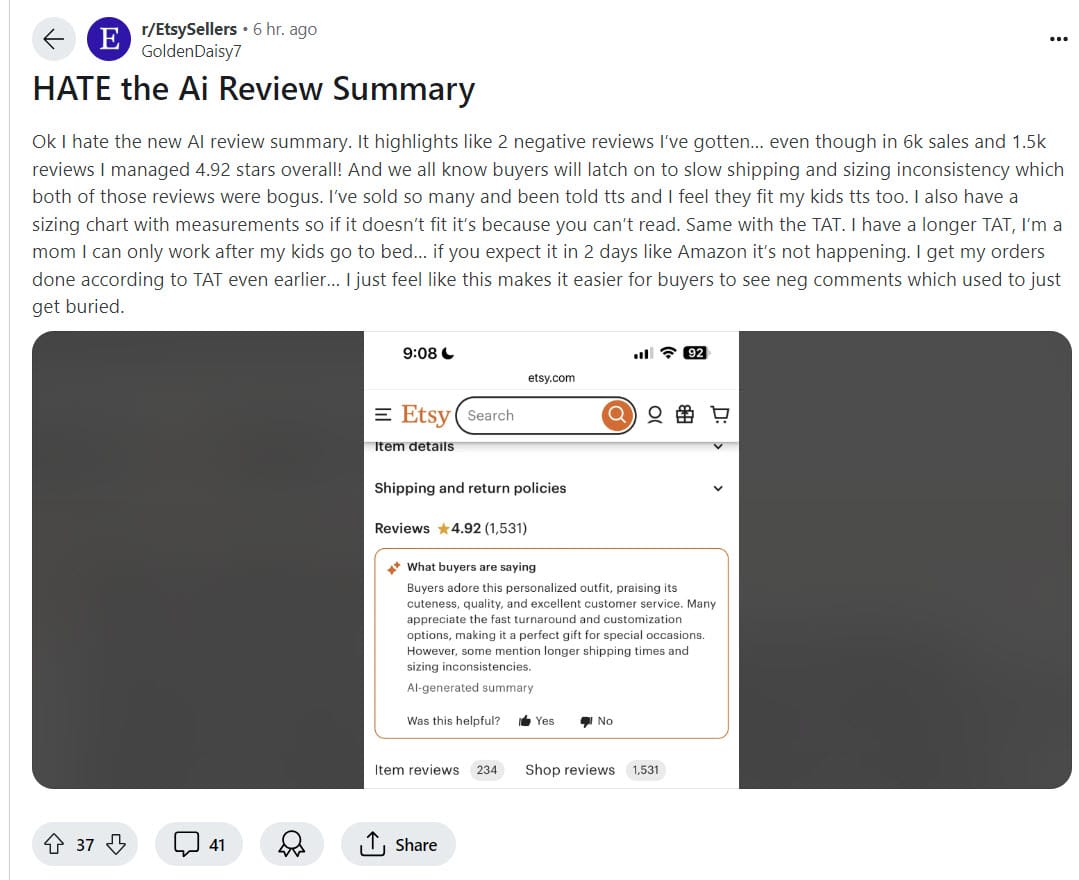 Etsy Tests AI Review Summaries - Sellers Say They Hate It