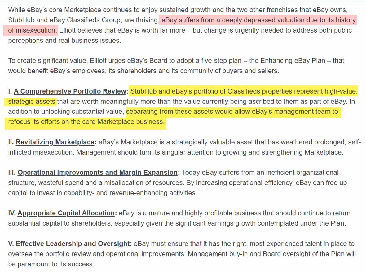 The references to misexecution were largely aimed at Wenig, but they certainly also applied to other members of the executive leadership team, and clearly Elliott was not impressed by how the core marketplace was being managed at the time either.