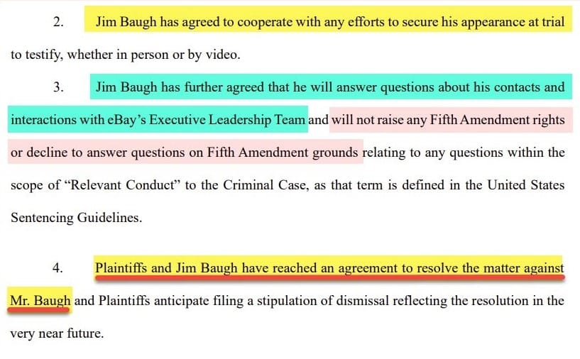 That agreement led eBay and the executive defendants to demand the opportunity to conduct further discovery and depositions against Baugh, and requesting that a protective order which has so far prevented questions about Baugh's alleged CIA past be lifted to allow the defendants to adequately prepare for trial and put forward their best defences against Baugh's testimony.