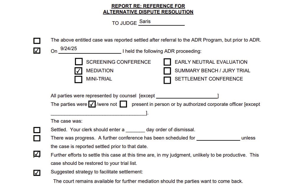 Magistrate Judge Marianne B. Bowler has submitted her Alternative Dispute Resolution report, advising Judge Patti Saris that mediation continues to be unsuccessful and "further efforts to settle this case at this time are unlikely to be productive", so the trial should remain on the schedule for January 2026.
