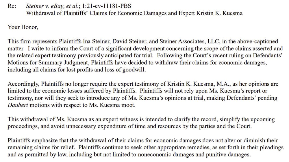 The Steiners have subsequently also withdrawn their claims for ~$10 Million in alleged loss of goodwill and lost profits for the EcommerceBytes business.