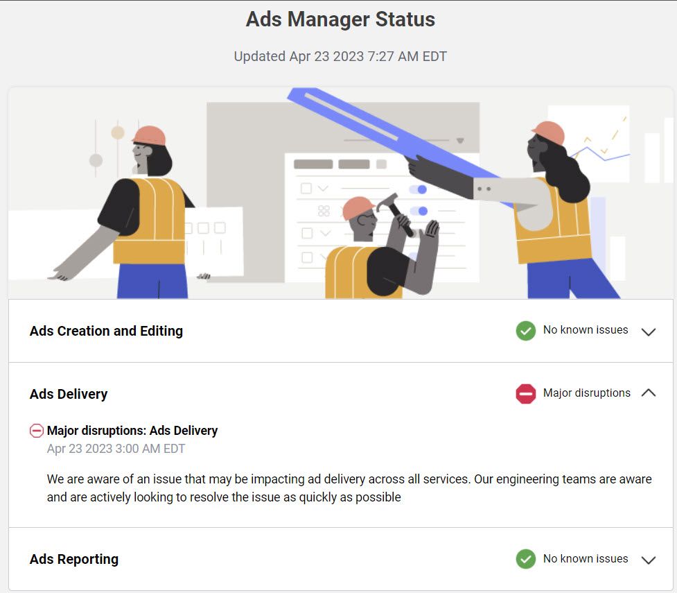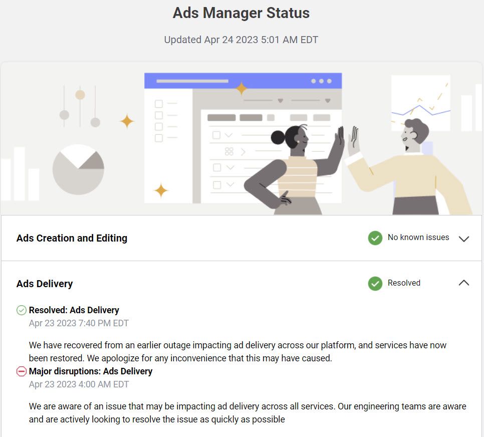 Meta shows the issue with ad delivery has been resolved and service has been restored. Still no official word on refunds or other compensation for impacted advertisers.