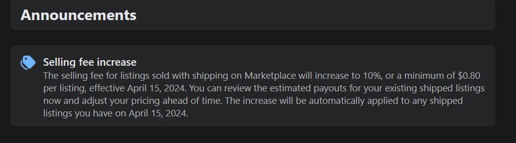 The selling fee for listings sold with shipping on Marketplace will increase to 10%, or a minimum of $0.80 per listing, effective April 15, 2024.You can review the estimated payouts for your existing shipped listings now and adjust your pricing ahead of time. The increase will be automatically applied to any shipped listings you have on April 15, 2024.
