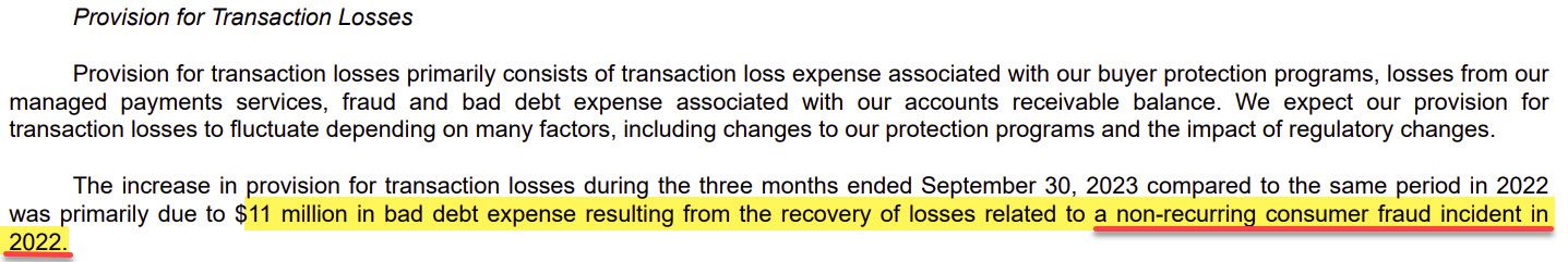 The increase in provision for transaction losses during the three months ended September 30, 2023 compared to the same period in 2022 was primarily due to $11 million in bad debt expense resulting from the recovery of losses related to a non-recurring consumer fraud incident in 2022.