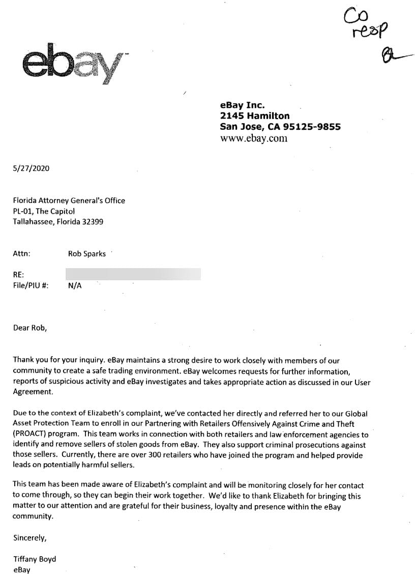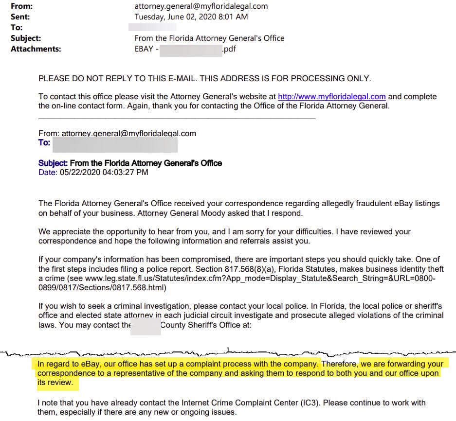 After contacting Florida Attorney General Ashley Moody's Office with my concerns, the matter was promptly punted back to eBay's PROACT (Partnering with Retailers Offensively Against Crime and Theft) department, citing a direct complaint process they had with eBay.