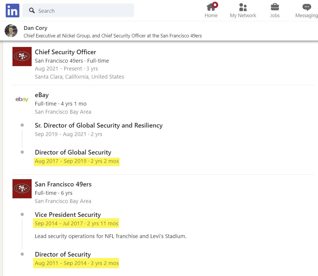 Cory served as Sr Director Global Security and Resiliency until August 2021, when he left to return back to the 49ers as Chief Security Officer.