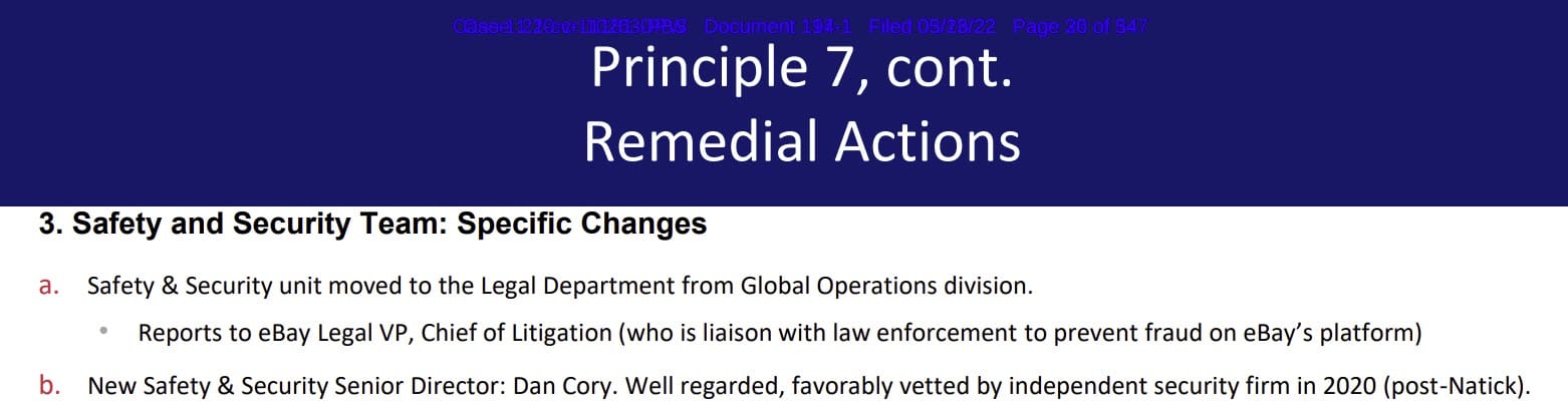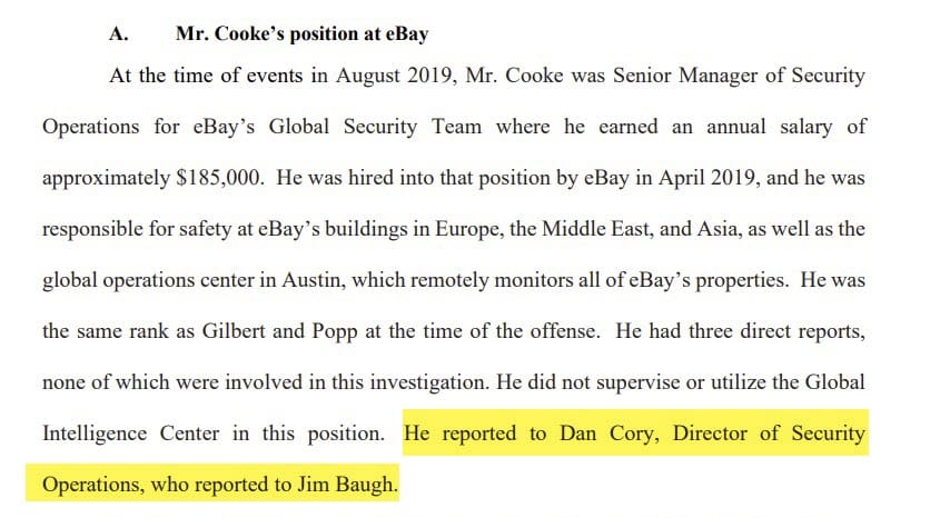 Cory was promoted to take over Baugh's position in the wake of this scandal, with eBay's internal investigation saying he was "well regarded and favorably vetted by an independent security firm in 2020" while apparently overlooking the role he may have played in recruiting and supervising members of security staff who were directly involved in this criminal conduct.