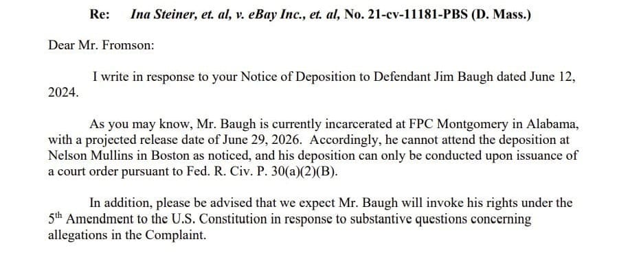 The plaintiffs are also moving ahead with discovery, seeking to depose several of the defendants, including Jim Baugh, who is still in federal custody and plans to invoke his 5th Amendment right against self-incrimination.