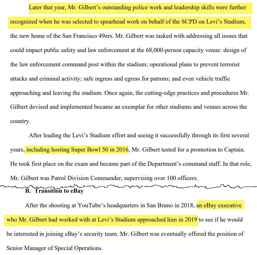 Gilbert doesn't name that executive specifically, but it's likely to have been Dan Cory, who was VP of Security for the 49ers before joining eBay and directly in the middle of the chain of command between Gilbert and Cooke and Jim Baugh at the time the cyberstalking events occurred.