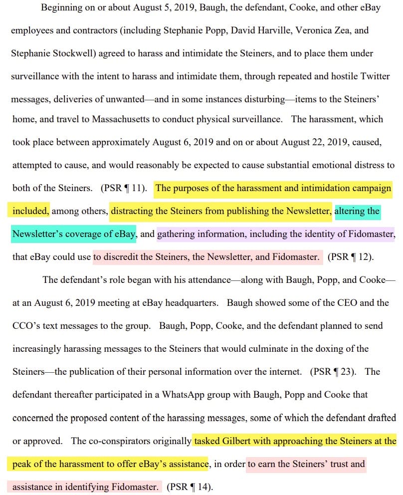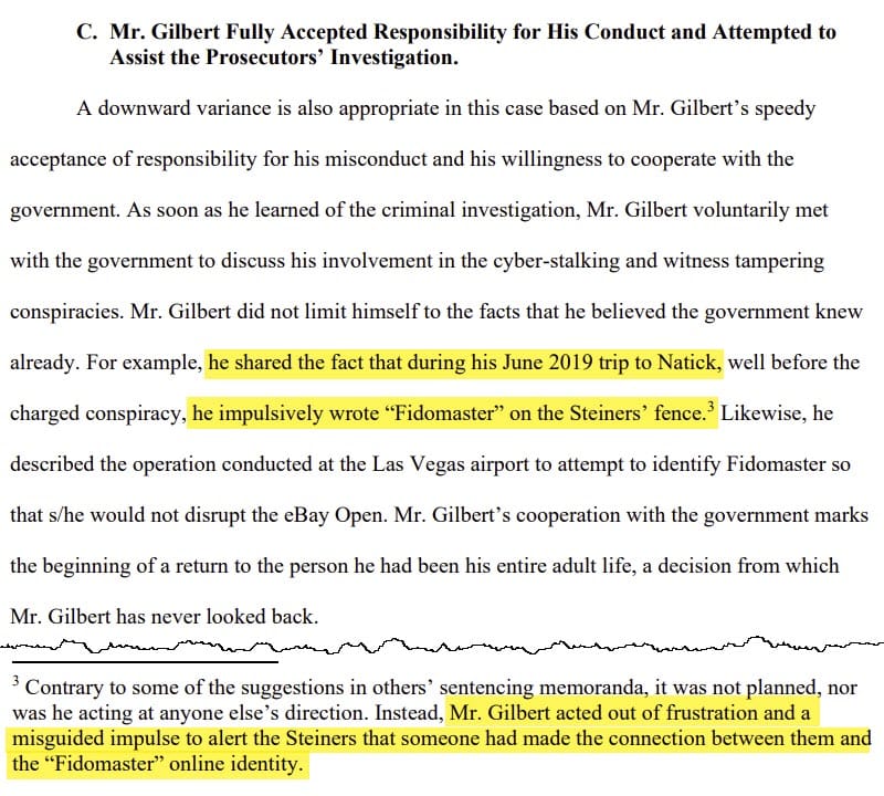 The recent filings also revealed new details about Gilbert's personal involvement in the crimes, including drafting threatening messages sent to the Steiners, tagging their fence with the word Fidomaster, and developing and implementing a "White Knight Strategy" aimed at offering to help the Steiners in order to gain their trust and assistance in outing Fidomaster/ unsuckEBAY.