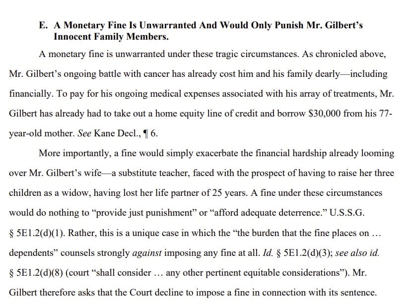 Gilbert's attorney has pleaded for additional leniency with no fine imposed, saying the "tragic circumstances" of his terminal diagnosis has put his family in dire financial straits.