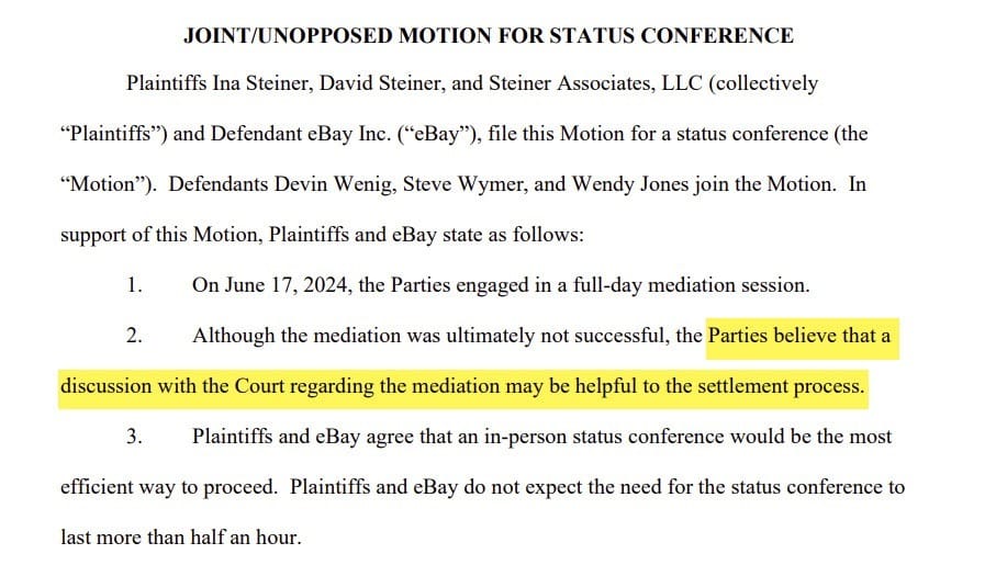 Saris has suggested if the lawsuit goes to trial, the proceedings may need to be split up, with claims against eBay, the c-suite executives, and the named criminal defendants tried in seperate groups in an effort to address the logistical challenges posed by such a complex case.