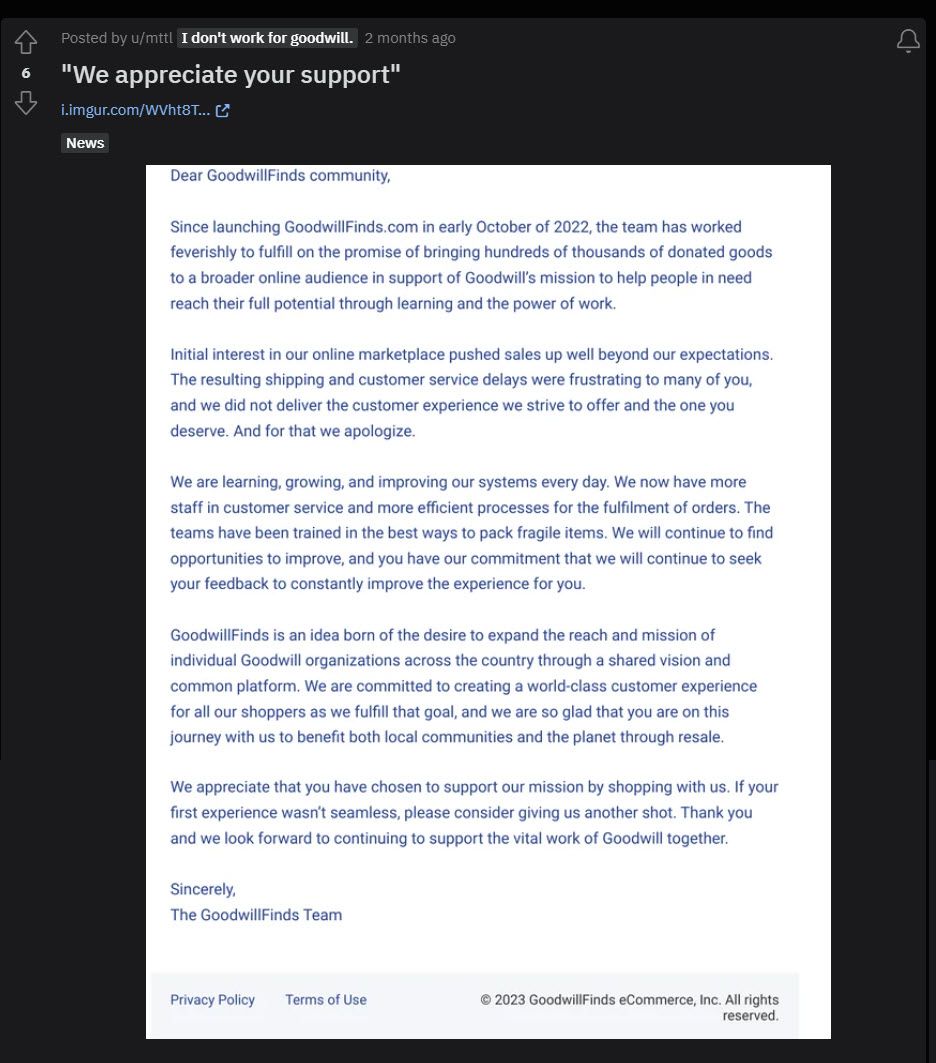 GoodwillFinds has been making efforts to try to address the issues and calm buyer concerns by sending out an apology email - but even that was apparently botched as users received multiple copies of the same email.
