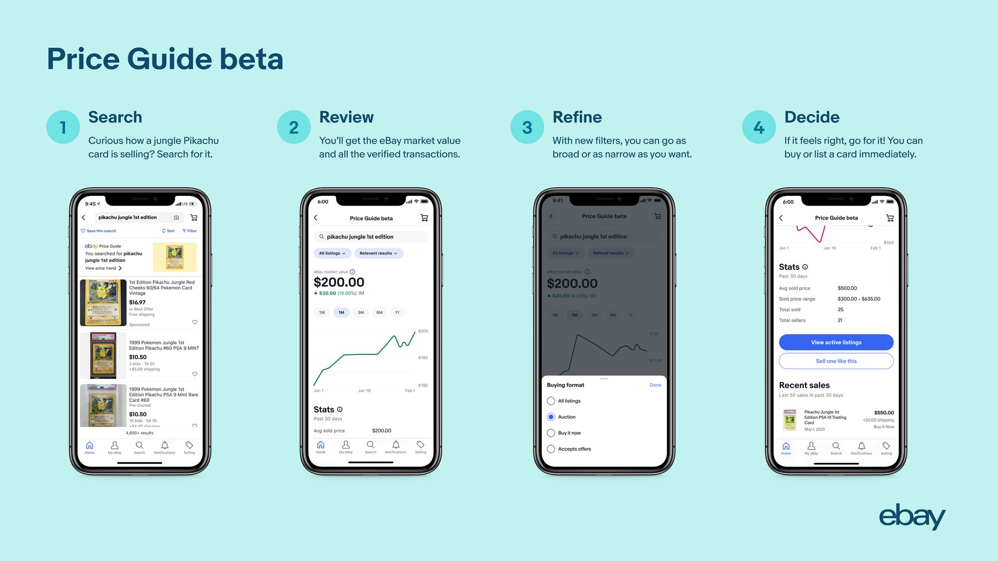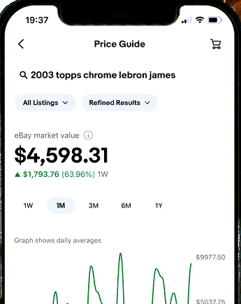 In the eBay app, simply search for the card you want and a banner at the top of the search results page will appear. Click on it to enter the price guide experience.