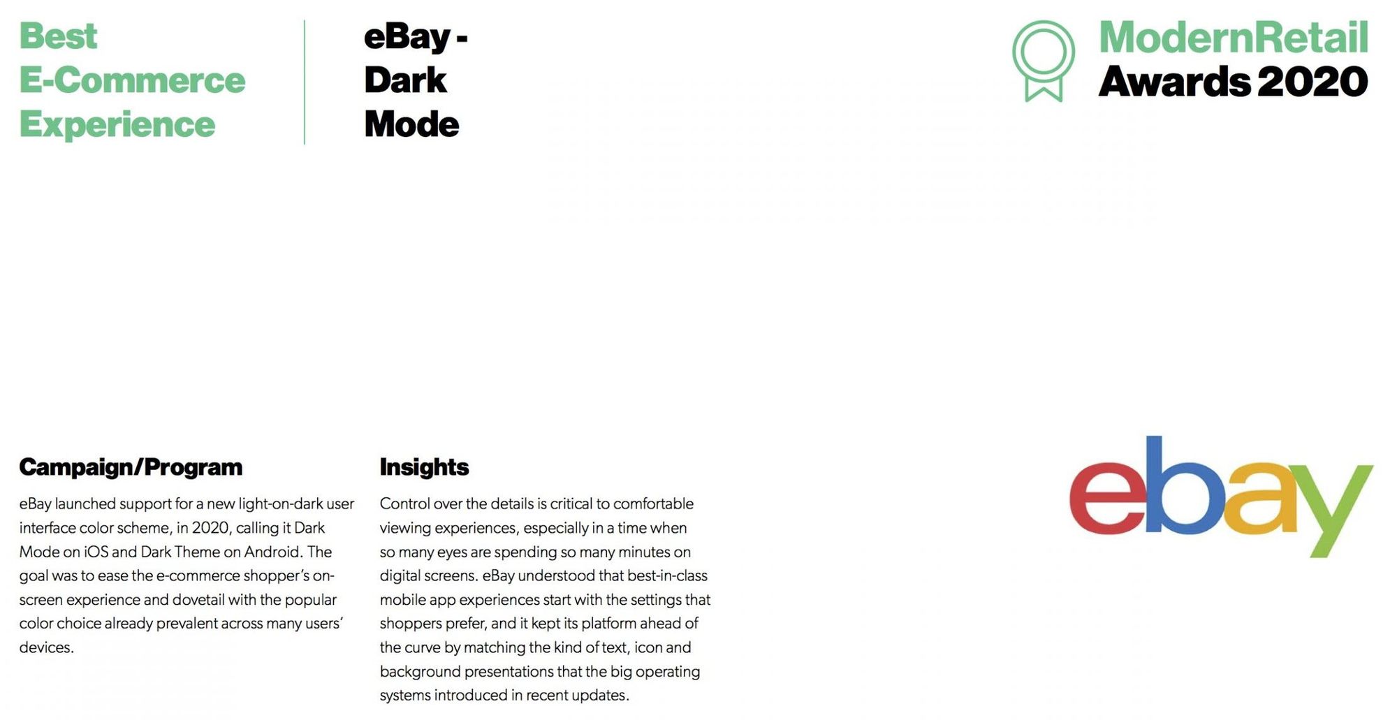 One of Jamie's accomplishments ticked off the list in his first year as CEO was to introduce Dark Mode for the eBay App. Sure, that's a nice feature, it even won an award, but was it really revolutionary or simply catching up with modern user experience preferences and aesthetics?