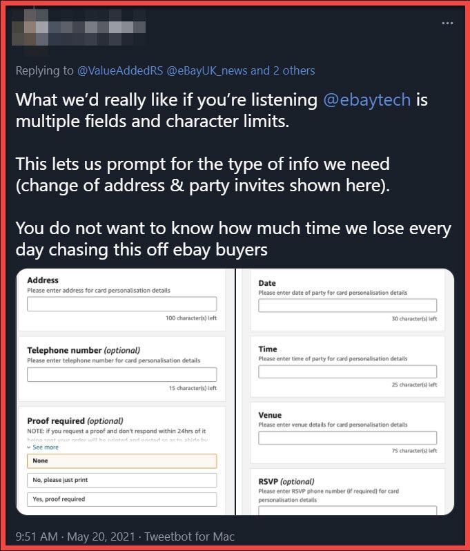The worst part is since whatever is written in the text box gets sent through eBay's messaging system which does not allow the exchange of personal information like email address or phone number, sellers who create custom items that might need those details found that messages with the buyer's custom information were being blocked.