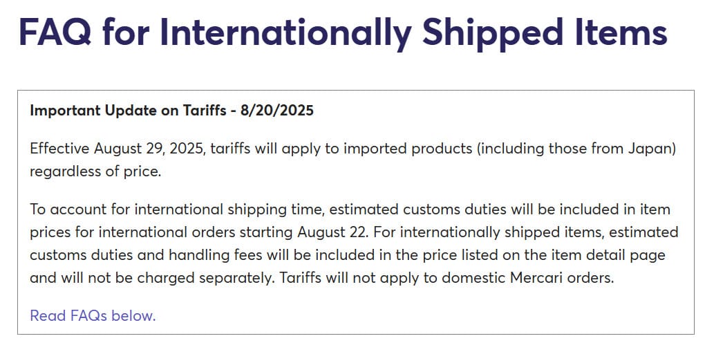 Mercari is warning users that items shipping from Japan via their partnership with BEENOS will have estimated customs duties added into item prices.