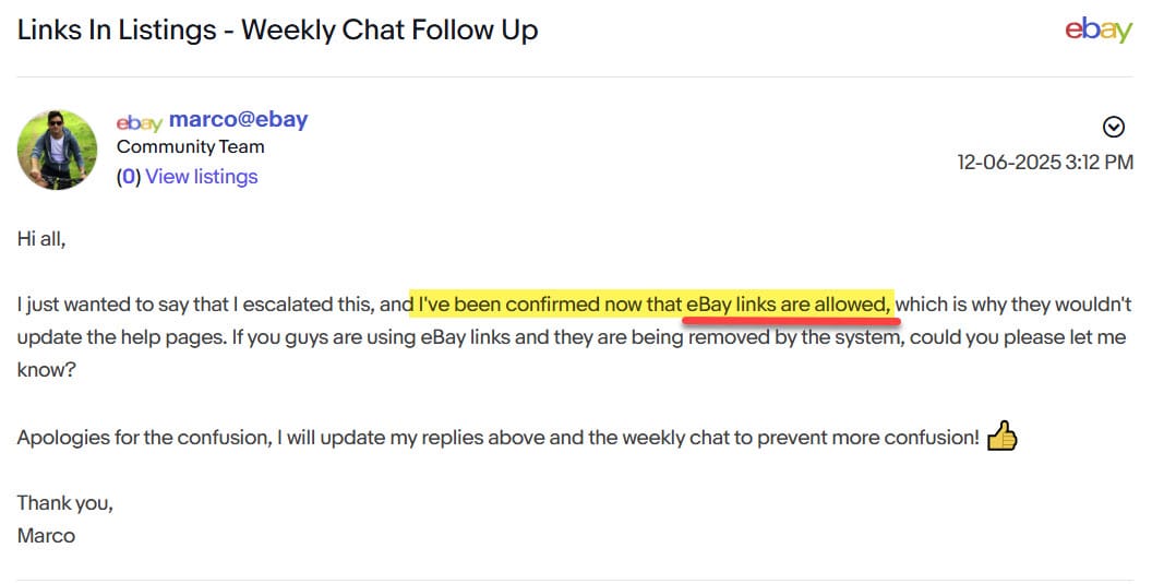 Hey marco@ebay I was just reading through today's chat posts and saw a question about links in listings that could use some follow up...