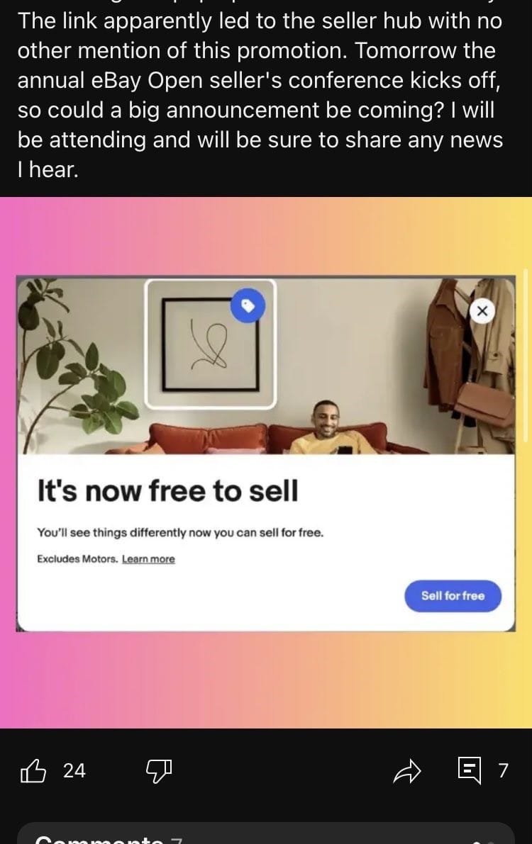 Rumors are swirling that eBay could be set to make a big announcement at their annual seller conference tomorrow, with some sellers reporting seeing a very odd message in Seller Hub today indicating fee-free selling could be coming to the US very soon!