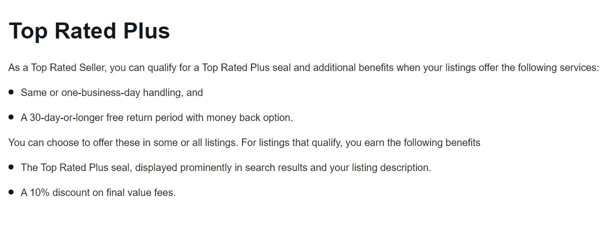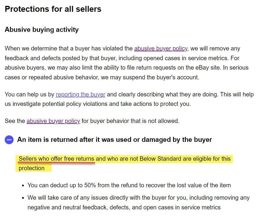 More importantly, certain seller protections and benefits do require sellers to offer a minimum of 30 day free returns in many categories, for example the Top Rated Plus program.