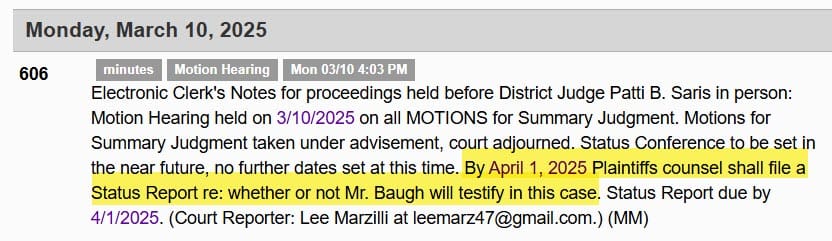 Judge Saris set an in person hearing on the motions for summary judgement for March 10th, where it appeared her decision may rest heavily on whether or not Baugh would testify if the civil case proceeds to trial, and she ordered the plaintiffs to provide a status update to the court on that subject no later than April 1, 2025.