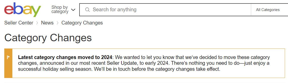 eBay is pushing back category changes that were announced in the Fall 2023 Seller Update. The changes were originally supposed to take effect October 24th, but now two days after the deadline, they have been put off until some unspecified date in early 2024.