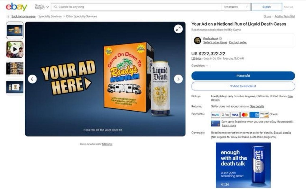 Liquid Death probably won’t sell us the ad on their box so we decided to put an ad on their eBay listing. So enough with the death talk already, crack open something smart!