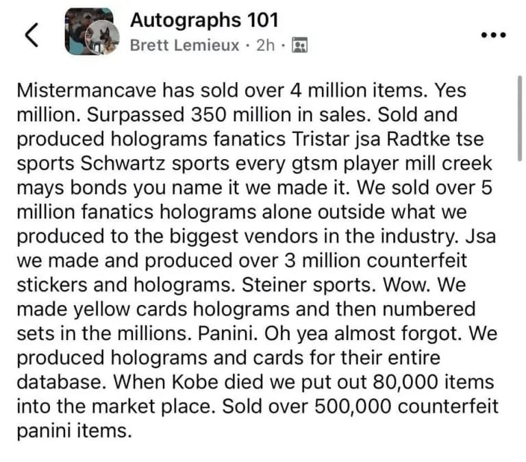 In the now deleted post, Brett Lemieux, a 45-year-old resident of Westfield, Indiana and founder of sports memorabilia site Mister ManCave claimed to have sold millions of counterfeit items with net profits exceeding $350 million.