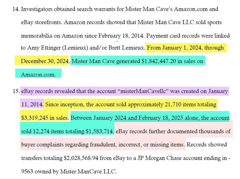Search warrants were obtained and it was determined that Mister Man Cave did ~$1.8M in sales through Amazon and ~$3.3M through eBay with 21,710 items sold.