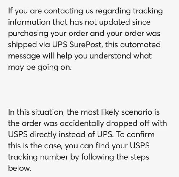 Conversely implied (though not explicitly stated) is that if you are contacting them about an item that does not have tracking updating and that item was not shipped with UPS Surepost, then that following paragraph does not apply.