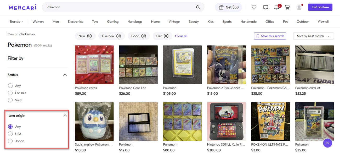 Buyers on the Mercari US site will now see items from Japan sold by BEENOS included in search, with the option to filter results just to Japan to see all BEENOS inventory or to US only if they want to exclude these items.