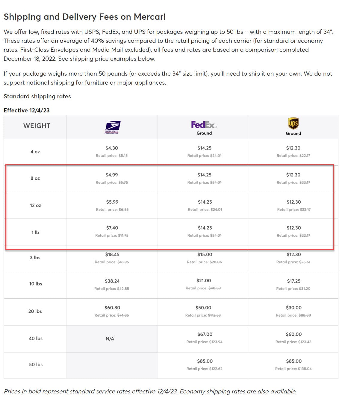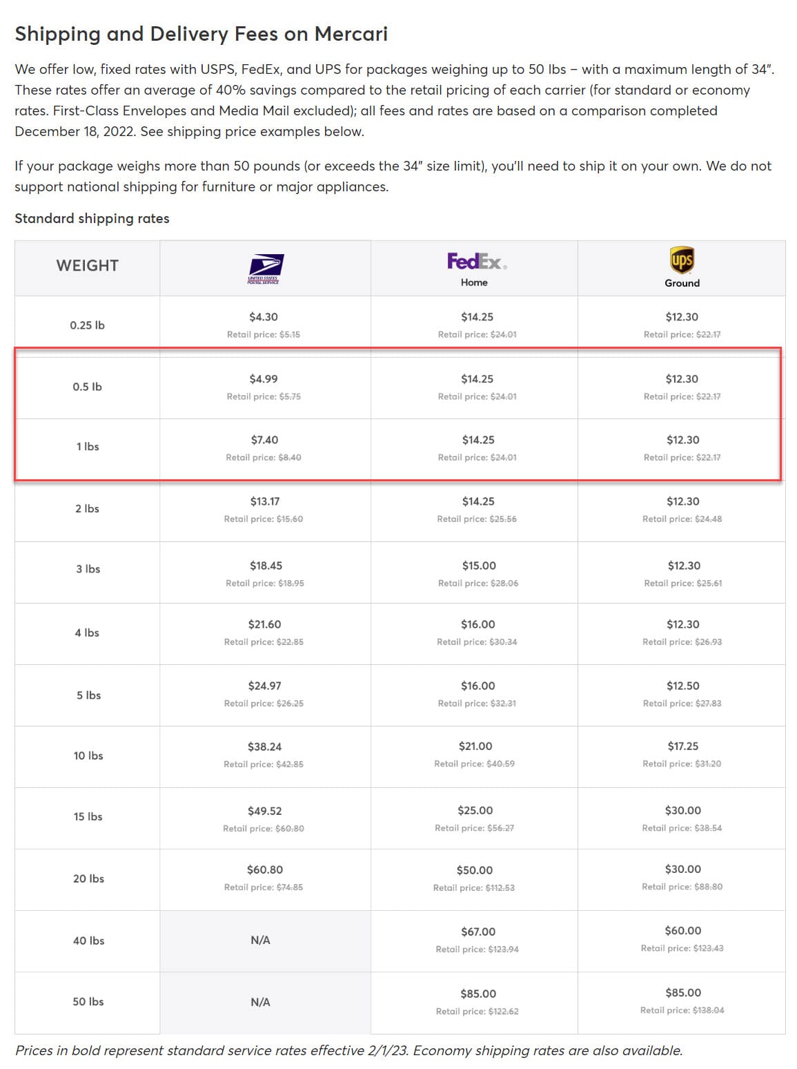 *All rates based on a comparison completed December 18, 2022. Change announcement 3/24/2022 We are pleased to share that FedEx Ground Economy (formerly FedEx SmartPost) is now offering better rates than previously announced. Starting 3/24/2022, improved rates for select FedEx Ground Economy prepaid labels will be available for new listings. Existing listings will be automatically updated on April 5, 2022 with the latest shipping rates. Seller-paid shipping rates only change on existing listings if you update the shipping option. Mercari Shipping Protection for coverage up to $200 still applies to all listings and all rates using Mercari Prepaid Labels. The latest standard and economy shipping rates are posted here. Change announcement 3/1/2022 We’re postponing the shipping price update for existing listings to April 5, 2022. Continue enjoying 2021 rates on your existing listings for a little longer. Remember: 2022 rates still apply to new listings. The latest standard and economy shipping rates are posted here. Change announcement 1/25/2022 Due to annual rate increases from shipping carriers, Mercari shipping prices will be updated on February 1. You’ll still get an average of 43% off retail for shipping labels between 0.25 lb – 150 lbs. And Mercari prepaid labels include Shipping Protection for peace of mind. If your item is lost or damaged in transit by the carrier, you’re covered up to $200. New shipping rates are effective February 1, 2022 for new listings with Mercari prepaid labels. Rates will also change on existing listings if the shipping option is updated. Starting March 1, 2022, existing listings will be subject to the new rates too. Seller-paid shipping rates only change on existing listings if you update the shipping option. Change announcement 3/1/2021 Due to the annual price increases from shipping carriers, Mercari shipping prices were updated on 03/01/2021. We are still offering on average 40% off retail for shipping labels between 0.25 lb - 150 lb. Change announcement 1/12/2021 We’re always looking for ways to make shipping as easy and affordable as possible. To give you an option to save even more, we’re reintroducing FedEx SmartPost at $7.99 for items weighing up to 3 lb. Please allow an additional 2 - 5 days for delivery for this shipping option. Change announcement 4/10/2020 Due to annual price changes from shipping carriers, Mercari shipping prices were updated on April 13, 2020. This will not impact listings created before this date. We are still offering on average 30% off retail for shippings labels weighing between 0.25 lb - 150 lb. USPS price change announcement FedEx price change announcement UPS price change announcement Change announcement 11/21/2019 On November 21, 2019, we simplified shipping. We’ll now provide the best and most affordable shipping options (for most items) at the time of listing. To give you the best pricing possible, we also added more weight classes. In addition, we are excited to announce a price reduction for USPS First Class Package Service. The label for 0.99 lb is now $4.99 instead of $5.25. Change announcement 9/17/2019 On September 17, 2019, we introduced a lower shipping weight class: $2.99 flat rate shipping for items weighing 4 oz and below. Change announcement 2/25/2019 On February 25, 2019, Mercari includes $200 Shipping Protection with every Mercari prepaid label. If your item is lost in transit, or the buyer files a return for damaged in transit, Mercari’s Shipping Protection has you covered. Due to annual price changes from shipping carriers, Mercari shipping prices increased. 2019 shipping carrier rate announcements: USPS price change announcement FedEx price change announcement UPS price change announcement Note: To see the latest in shipping make sure you are using the latest version of the app.