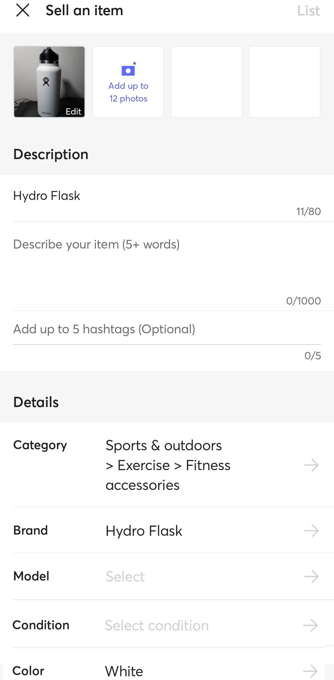 In the first test, the app was able to recognize the brand name, probably using OCR (optical character recognition) on the text and/or logo, correctly identified this as a Hydro Flask bottle and chose the correct category and color - however, you can see there's still quite a bit of information needed from the seller to make a complete listing.