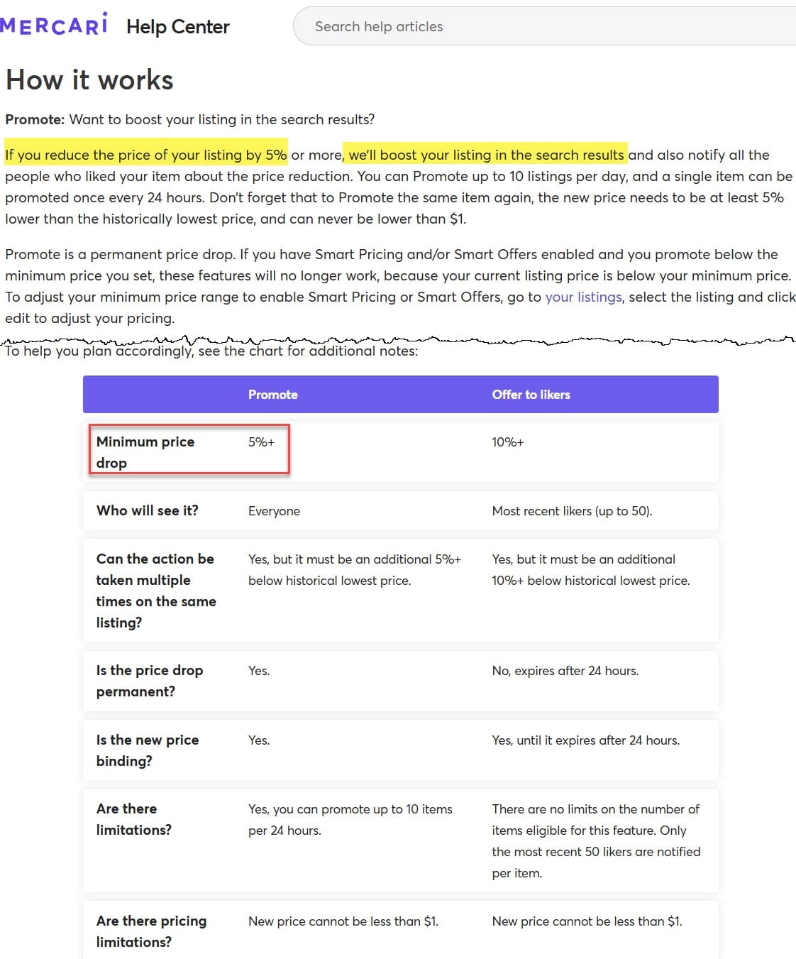 The Promote feature usually requires sellers to permanently drop their price 5%, and in fact the Mercari help and policy page still states that is the minimum today.