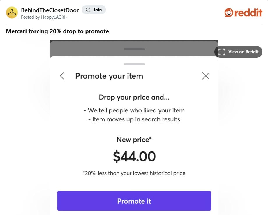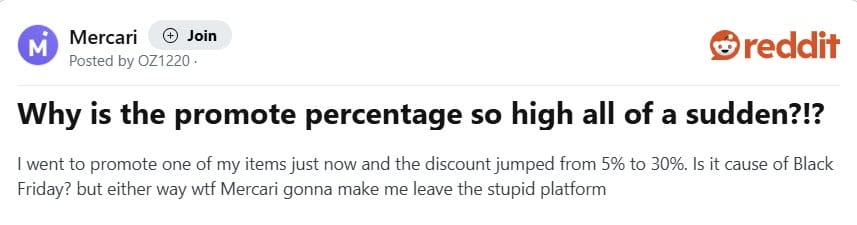 Mercari US sellers are waking up to an unpleasant surprise ahead of Black Friday Cyber Weekend holiday shopping rush as an apparent update to Promote items feature now requires 20-30% discounts with no notice or public announcement.