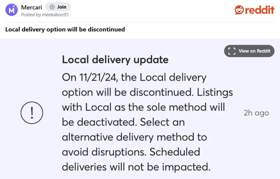 And now Mercari Local appears to be the next victim, with sellers reporting on Reddit they received less than 24 hours notice that they will need to update listings that only offer Local Delivery to avoid having them deactivated.