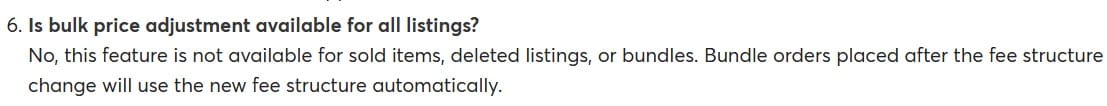 No, this feature is not available for sold items, deleted listings, or bundles. Bundle orders placed after the fee structure change will use the new fee structure automatically.